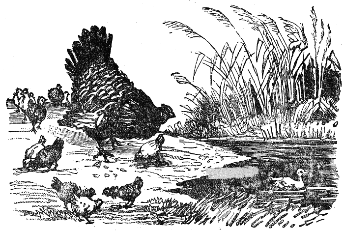 Кокошката започна да учи дечицата си как да изравят червейчета от земята и поведе цялото си семейство към брега на езерото: там значи червеите са повече и земята е по-мека. Щом късоногото пиленце зърна водата, удари направо и се хвърли в нея. Кокошката крещи, маха криле, хвърля се във водата; пиленцата също се разтревожиха: бягат, суетят се, пищят, а едно петленце от страх дори скочи върху едно камъче, протегна шийката си и за първи път през живота си закрещя с прегракнал глас: „Ку-ку-ри-гу! Помогнете, каже, добри хора! Братчето потъва!“ Но братчето не потъна, а извънредно весело и леко като грамче памучна прежда си плуваше по водата, която гребеше с широките си ципести лапички. Като чу, че кокошката крещи, старата Даря дотърча от къщи, видя какво става и започна да вика: „Ех, какъв грях! Нали не виждам, турила съм под кокошката патешко яйце.“