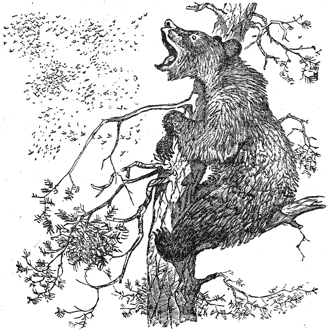 Много ли, малко ли се сражава Миша с комарите, ала шумът беше голям. Далеко се чуваше мечешкият рев. Я колко дървета изкорени, колко камъни преобърна!… Все му се искаше да докачи първо Комар Комарович: ами че той се върти ей тук, над самото му ухо, а цапне ли се мецан с лапата — пак нищо, само цялата си муцуна изподраска и разкървави.