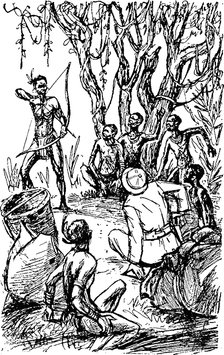 Един сухичък, малко свит туземец, с голяма халка на лявото ухо, ловко скочи назад. Беше Нгвуно. Павел трепна и крадешком го проследи, но изведнъж лицето му побледня. Негърът стоеше срещу него грозно озъбен. На изпънатия му лък трепереше отровна стрела. Ръката на географа бързо се плъзна назад и след миг блесна пистолетът… Внезапен трясък накара негрите да паднат по очи.