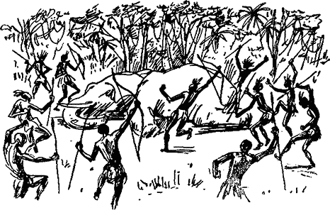 Слонът издъхваше и от раните му изтичаше гъста черна кръв. Туземците притичаха, но още не се бяха доближили до убитото животно, отстъпиха разочаровани.