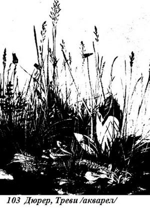 Никой не е изобразявал с по-големи подробности природни обекти, цветя, треви и животни; и все пак ми се струва, че нещо липсва в тях — вътрешният живот. Сравнете прочутата му акварелна картина, изобразяваща трева (103), с една рисунка на Леонардо (104); колко й липсва творческа целенасоченост и чувство за органичния живот — тя прилича на кутия с препарирано животно в нея.
