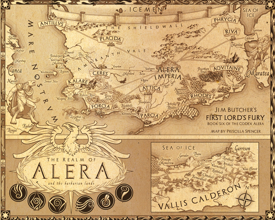 [Картите са от страницата на Джим Бъчър: http://www.jim-butcher.com/posts/2009/codex-alera-map — Бел. ел. кор.]