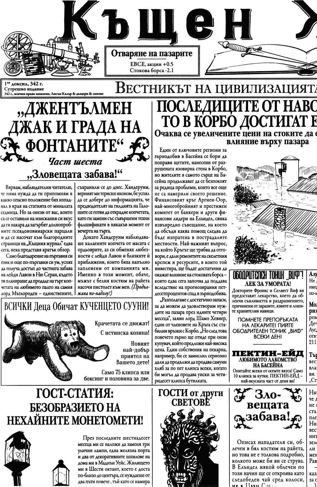 Излезе от стаята си в имението на Уакс с нехайна походка и забеляза мимоходом аромата на прясно опечен хляб за закуска, който се носеше от кухненските помещения. Бе благодарен за стаята, но всъщност нощуваше тук само заради безплатната храна. Е — и заради Уакс. Човекът определено се нуждаеше от компания, за да не изпада в още по-големи странности.