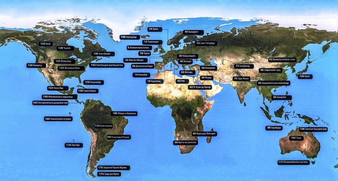 В тази книга са представени 50-те най-известни забележителности на света, много от които са включени в списъка на ЮНЕСКО за опазване на природното и културното наследство на планетата. Като туристически дестинации те са пръснати по цялото земно кълбо — от най-северния град на Земята, където Северното сияние озарява зимното небе, до аржентинската Тиера дел Фуего, разположена в най-южния край на нашия свят.