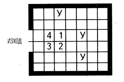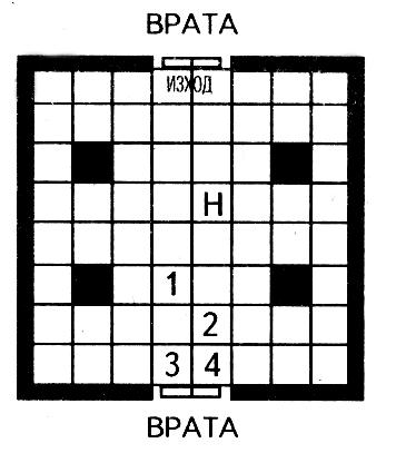 Цифрите върху тази тактическа карта показват къде стоят Приключенците в началото на сражението. Буквите „Ч“ указват първоначалното местоположение на чудовищата.